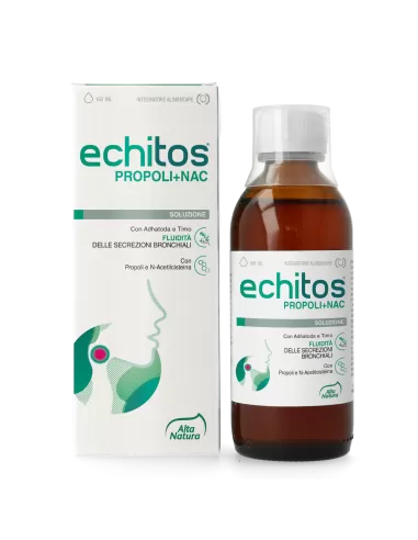 Echitos Propolnac a base di Propolnac miscela di Propolis M.E.D. con N-Acetilcisteina. Arricchito con estratti di Adhatoda e Timo utili per la fluidità delle secrezioni bronchiali e il benessere di naso e gola. Con olio essenziale di Eucalipto e gemmoderivato di Cedro del Libano ad effetto balsamico.