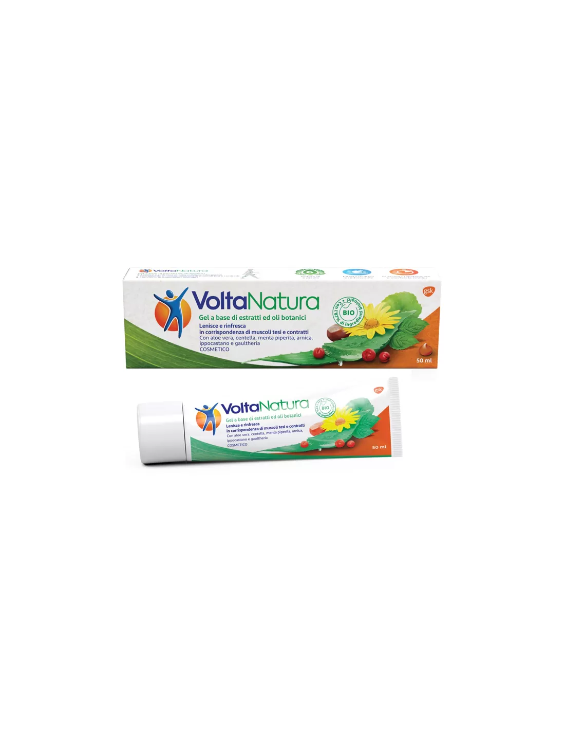 VoltaNatura è un gel a base di estratti ed oli botanici. Con aloe vera, centella, menta piperita, arnica, ippocastano e gaultheria.