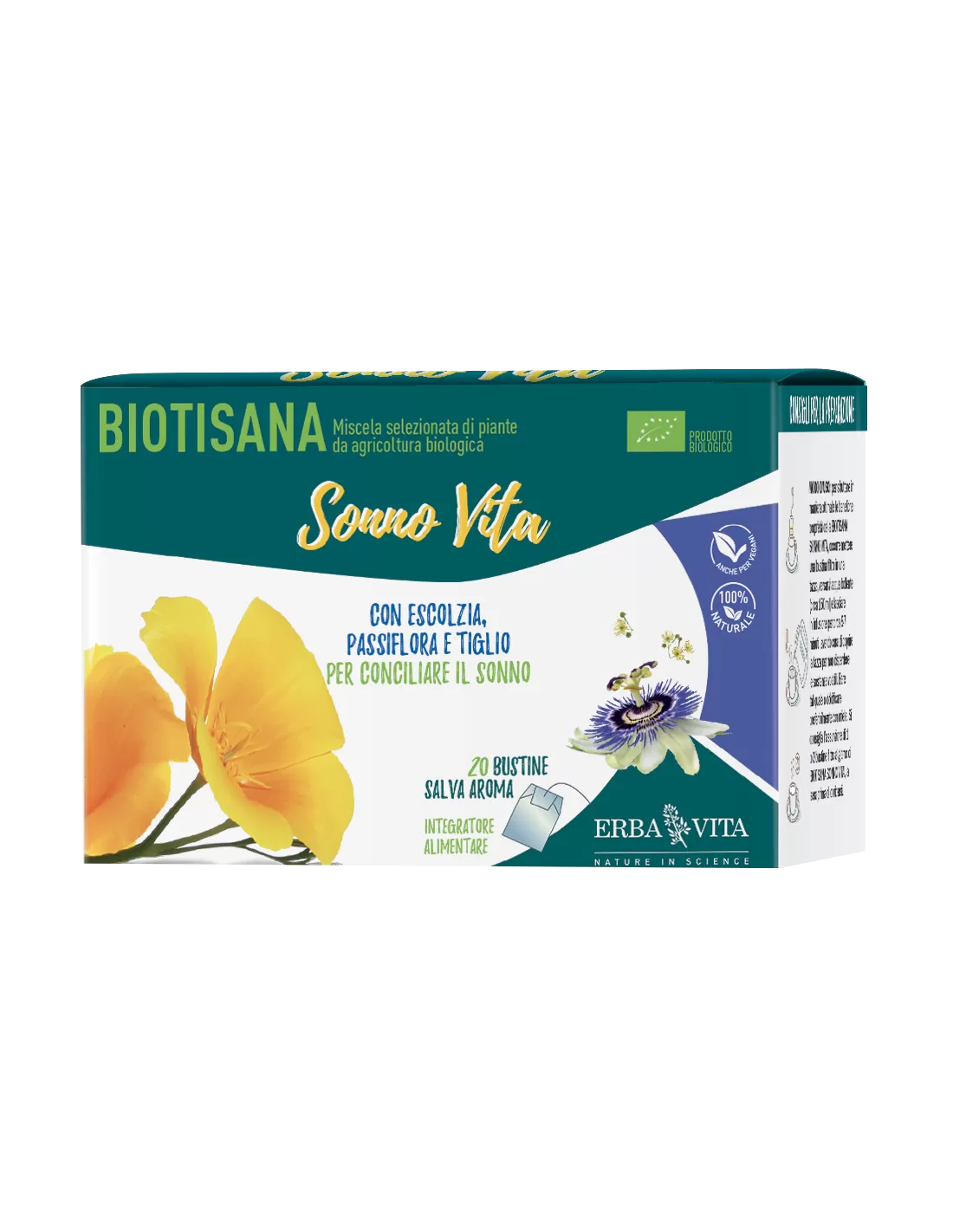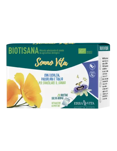 La Biotisana Sonno Vita contiene una miscela selezionata di piante officinali provenienti da coltivazione biologica: Escolzia, Passiflora e Tiglio sono utili per favorire il fisiologico rilassamento e conciliare il sonno, mentre la Melissa e il Biancospino supportano il benessere mentale.