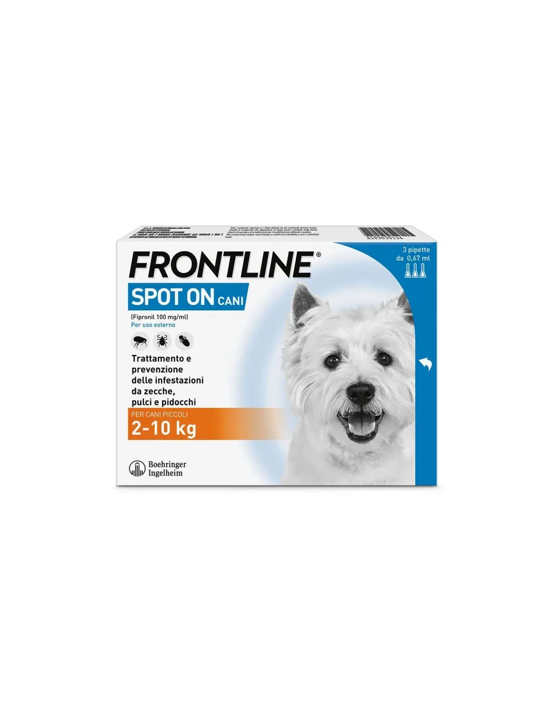 BOEHRINGER ING.ANIM.H.IT.SpATrattamento e prevenzione delle infestazioni da zecche (Rhipicephalus spp., Dermacentor spp., Ixodes spp.), da pulci (Ctenocephalides spp.) e da pidocchi nei cani adulti e nei cuccioli. Il fipronil esplica rapidamente la sua azione letale sulle zecche , impedendo lo sviluppo del parassita e l'eventuale trasmissione di infezioni di cui la zecca sia vettore. E' attivo contro le principali specie di zecche presenti sul territorio nazionale, tra cui Ixodes ricinus , responsabile della trasmissione della malattia di Lyme al cane, al gatto e all'uomo. Il fipronil agisce sulle pulci uccidendo rapidamente le forme adulte, prevenendo così la deposizione di uova e quindi nuove infestazioni. Grazie al l'azione letale sulle pulci adulte, il fipronil contribuisce efficacemente al controllo ed alla risoluzione della Dermatite Allergica da Pulci (DAP) che, nel cane, è provocata dall'azione sensibilizzante esercitata dagli antigeni contenuti nella saliva di tali parassiti. Il fipronil inoltre, con un singolo trattamento, controlla e risolve in modo rapido e definitivo le infestazioni da pidocchi , in particolare quelle provocate da Trichodectes canis , pidocchio masticatore del cane.