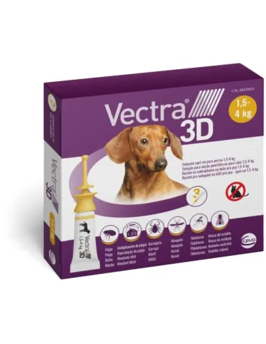 Vectra 3D 1,5 - 4 Kg è un antiparassitario veterinario per cani per la prevenzione di infestazioni da pulci e zecche e per l’attività repellente di flebotomi, zanzare e mosche. Il farmaco ha effetto per un mese e previene l’apertura delle uova delle pulci per due mesi.