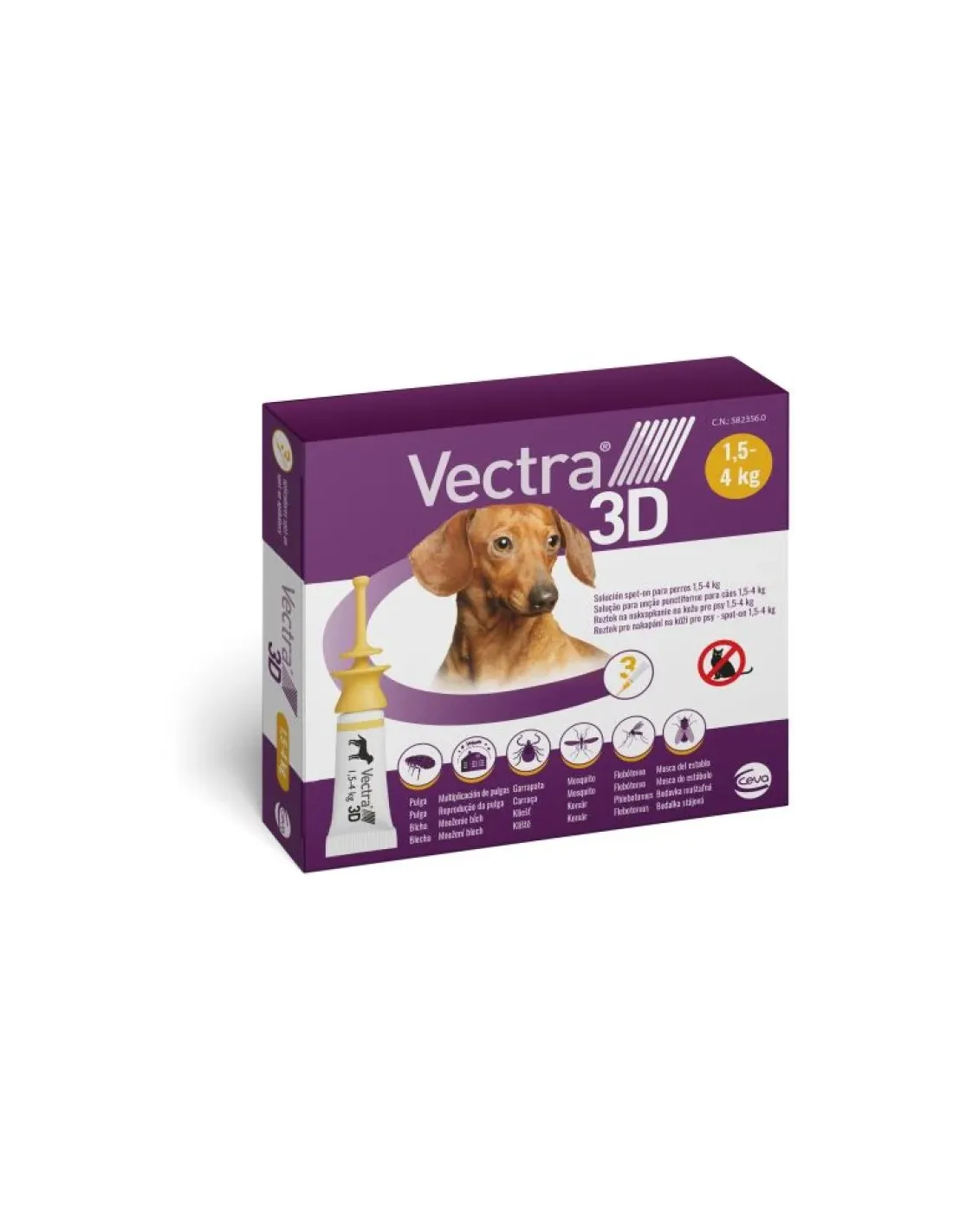 CEVA SALUTE ANIMALE SpAVectra 3D 1,5 - 4 Kg è un antiparassitario veterinario per cani per la prevenzione di infestazioni da pulci e zecche e per l’attività repellente di flebotomi, zanzare e mosche. Il farmaco ha effetto per un mese e previene l’apertura delle uova delle pulci per due mesi.