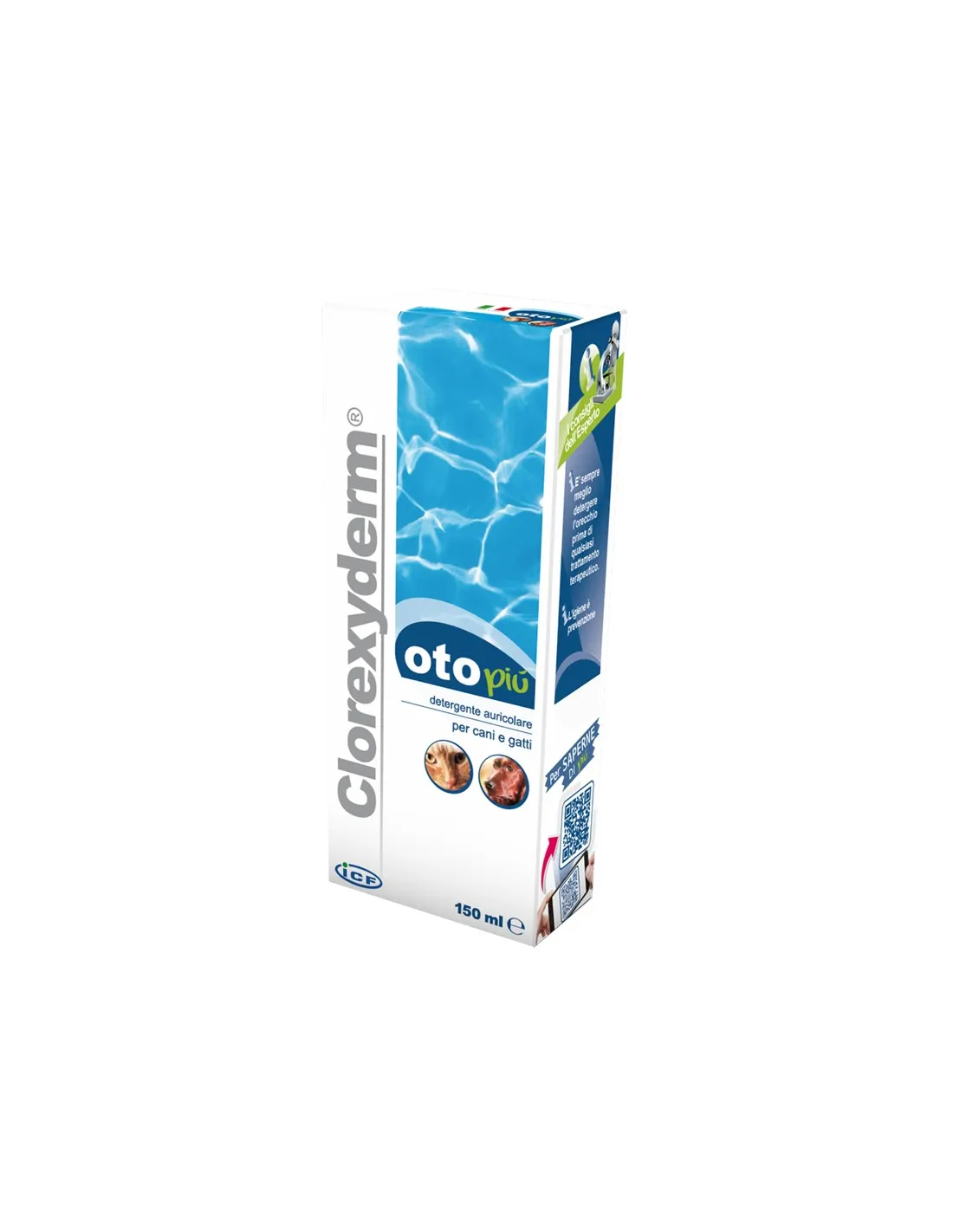 Icf clorexyderm oto più è per la pulizia di routine del condotto auricolare del cane e del gatto, dei cuccioli e dei gattini.