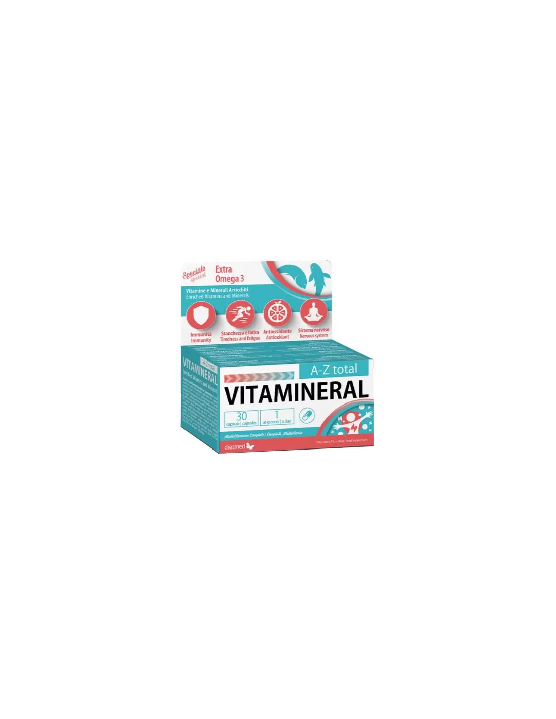 pesce omega 3 (12% DHA - acido docosaesanoico - e 18% EPA - acido eicosapentaenoico); capsula: gelatina; acido L-ascorbico (vitamina C); agente di carica: cellulosa microcristallina; solfato ferroso, acetato di DL-alfa-tocoferile (vitamina E), nicotinamide (vitamina B3), ossido di zinco; agente antiagglomerante; sali di magnesio degli acidi grassi; gluconato di rame, acetato di retinile (vitamina A), D-pantotenato calcio, (vitamina B5), solfato di manganese, cianocobalamina (vitamina B12), luteina, colecalciferolo (vitamina D); agente antiagglomerante: biossido di silicio; cloridrato di piridossina (vitamina B6), cloridrato di tiamina (vitamina B1), acido pteroil-monoglutammico (vitamina B9), cloruro di cromo, ioduro di potassio, selenito di sodio, molibdato di ammonio, fillochinone (vitamina K), D-biotina (vitamina B8).