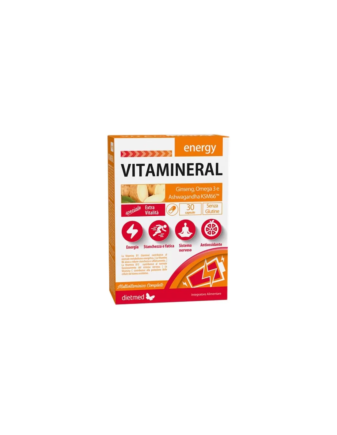 pesce omega-3 microincapsulato (7,2% DHA - acido docosaesaenoico - e 10,8% EPA - acido eicosapentaenoico); capsula: gelatina; Panax ginseng (ginseng, estratto secco di radice titolato minimo al 30% in ginsenosidi), Withania somnifera (Ashwagandha KSM-66, estratto secco brevettato di radice), Rhodiola rosea (rodiola, estratto secco di radice titolato minimo al 3% in rosavina e al 1% in salidroside), pappa reale liofilizzata (3:1); agente di carica: cellulosa microcristallina; acido L-ascorbico (vitamina C), nicotinamide (vitamina B3); agente antiagglomerante: sali di magnesio degli acidi grassi; ossido di zinco, D-pantotenato di calcio; agente antiagglomerante: biossido di silicio; cianocobalamina (vitamina B12) (0,1%), cloridrato di piridossina (vitamina B6), cloridrato di tiamina (vitamina B1), acido pteroilmonoglutammico, D-biotina (vitamina B8).