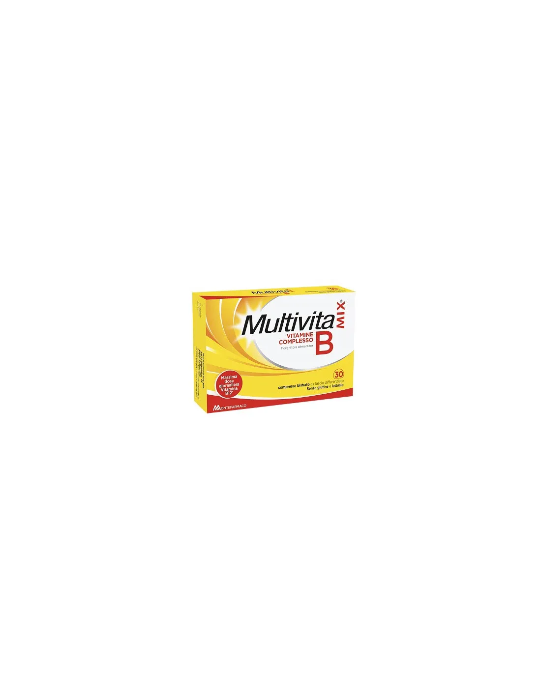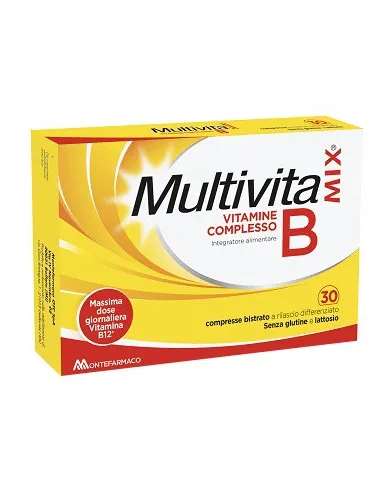 MONTEFARMACO OTC SpAMultivitamix Vitamine Complesso B con alto contenuto di Vitamina B12 contiene le vitamine del gruppo B. La sua forma in compressa bistrato, è stata studiata per differenziare il rilascio della vitamina B12 durante la giornata.